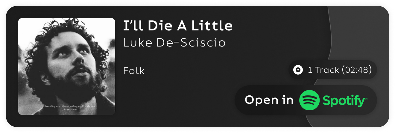I remember hearing how Luke's voice fluttered as he stretched words, not too different from how Jeff Buckley added further elasticity into his delivery. I remember exclaiming "Yesssss, that's beautiful" in response to Luke's cathartic song structure as I reached for the silver, grooved volume knob and dared my Volvo's speaker system to move closer to its limit. I can't describe adequately what it is about this song that struck me so, I think it has something to do with the layered repetition that sets on towards the end of the song. Let me know if you relate, would love to chat about it.