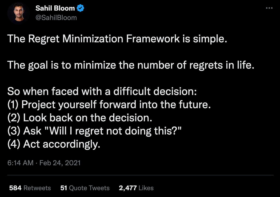 I discovered this year that I use regret as a compass from which I base my decision making. I optimistically indulge in the notion that this can be an effective way of guiding yourself towards a softer deathbed burdened by less what if moments. It turns out there is actually a mental model framework for this called: The Regret Minimization Framework. Apparently it has been popularized by Jeff Bezos recently. It's easy to do, Sahil Bloom summarized it like such: